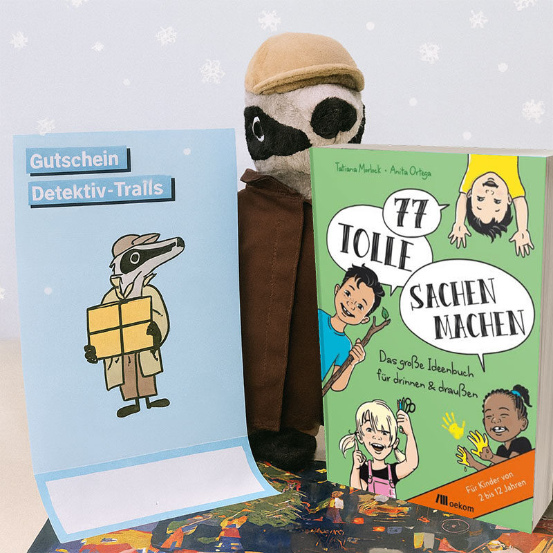 Dieses Paket vereint drei Elemente, die zusammen viel mehr sind als die Summe ihrer Teile: Das 77 tolle Sachen machen… Buch sorgt für kreative Beschäftigung und neue Ideen zu Hause oder unterwegs. Das Plüschtier bringt emotionalen Wert, verbindet sich mit dem Erlebnis und wird Freund und Erinnerung zugleich. Der Gutschein öffnet die Tür zu echten Erlebnissen – gemeinsames Rätseln, Bewegung an der frischen Luft, Familienzeit. So entsteht ein Rundum-Abenteuer für Kinder und Familien. Für Familien mit Kindern, Geburtstags- oder Geschenkidee, Regentage, Ferien-Nachmittage oder einfach als Überraschung für neugierige Entdecker. Auch ideal kombiniert mit einem unserer Detektiv-Trails draußen in der Stadt oder in der Natur.